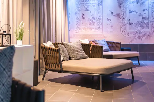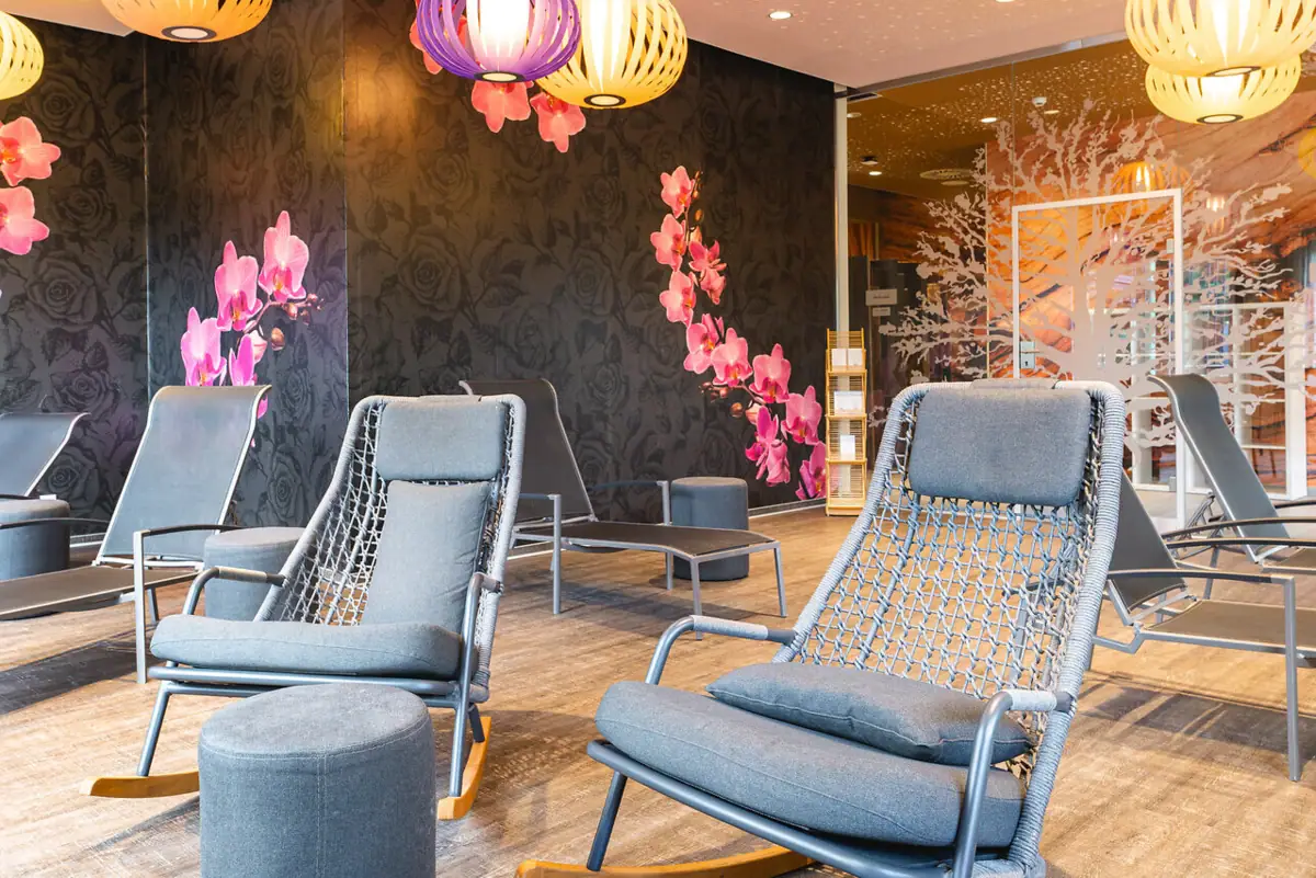 Tijd voor een pauze van het zwemmen? Maak het jezelf dan gemakkelijk in onze ontspanningsruimte. Kruip lekker weg in je badjas, sluit je ogen en geniet van de rust. Hier kun je aan het eind van de dag even helemaal tot rust komen.